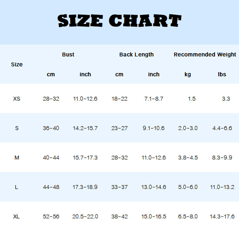 Size selection should prioritize chest circumference and back length, especially for breeds like Schnauzers, French Bulldogs, and cats.